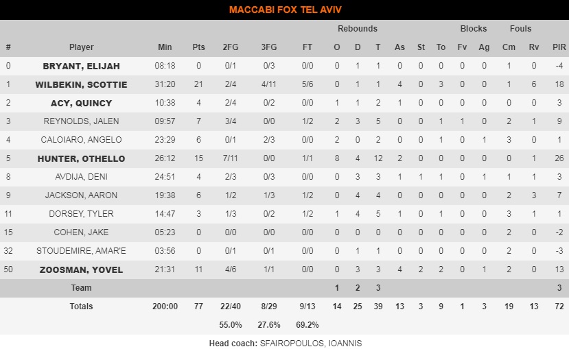 Στους 21 πόντους σταμάτησε ο Σκότι Γουίλμπεκιν, που είχε 2/2 βολές στο φινάλε και έγιρε την πλάστιγγα υπέρ της Μακάμπι, με τον Σέιν Λάρκιν -που αγωνίστηκε ξανά μετά τον τραυματισμό του- να αστοχεί στο τελευταίο σουτ του αγώνα.