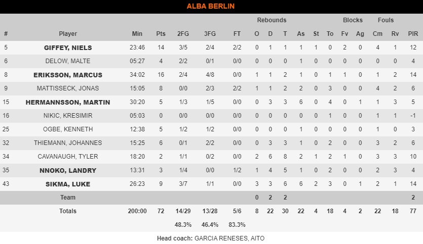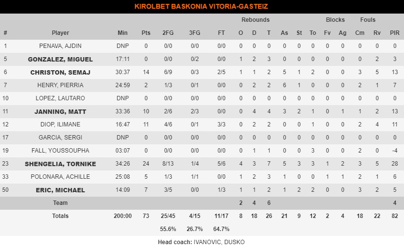 Κορυφαίος των νικητών ήταν ο Τόρνικε Σενγκέλια, ο οποίος τελείωσε τον αγώνα με 24 πόντους, 7 ριμπάουντ και 5 ασίστ, ενώ έκανε και το κόψιμο στην τελευταία φάση του αγώνα, σφραγίζοντας τη νίκη της ομάδας του. Αυτός που υπέγραψε το τελικό σκορ ήταν ο Τζάνινγκ με τρίποντη «βόμβα» στα 3,2’’ πριν το φινάλε. Από πλευράς ηττημένων, πρώτος σκόρερ ήταν ο Έρικσον με 16 πόντους και 4/8 τρίποντα.