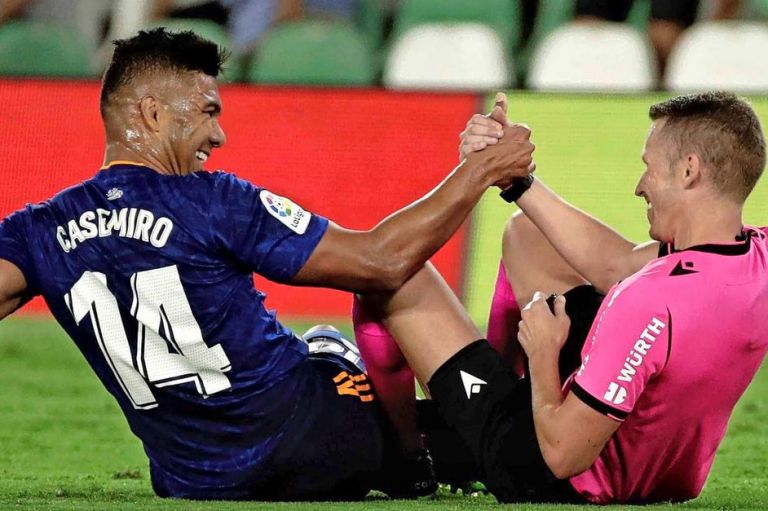 Ο Καζεμίρο έκανε άθελά του τάκλιν στον διαιτητή στην προσπάθειά του να κόψει την επίθεση της Μπέτις, με το αποτέλεσμα να κάνει και τους δύο να χαμογελάσουν.
