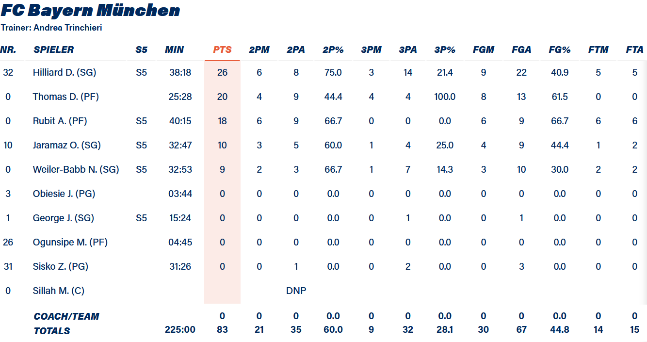 Η Μπάγερν οδήγησε το ματς στην παράταση, αν και βρέθηκε πίσω στο σκορ με 75-71, ισοφάρισε με δύο βολές του Ουάιλερ - Μπαμπ και δίποντο του Χίλιαρντ, που σταμάτησε στους 26 πόντους.