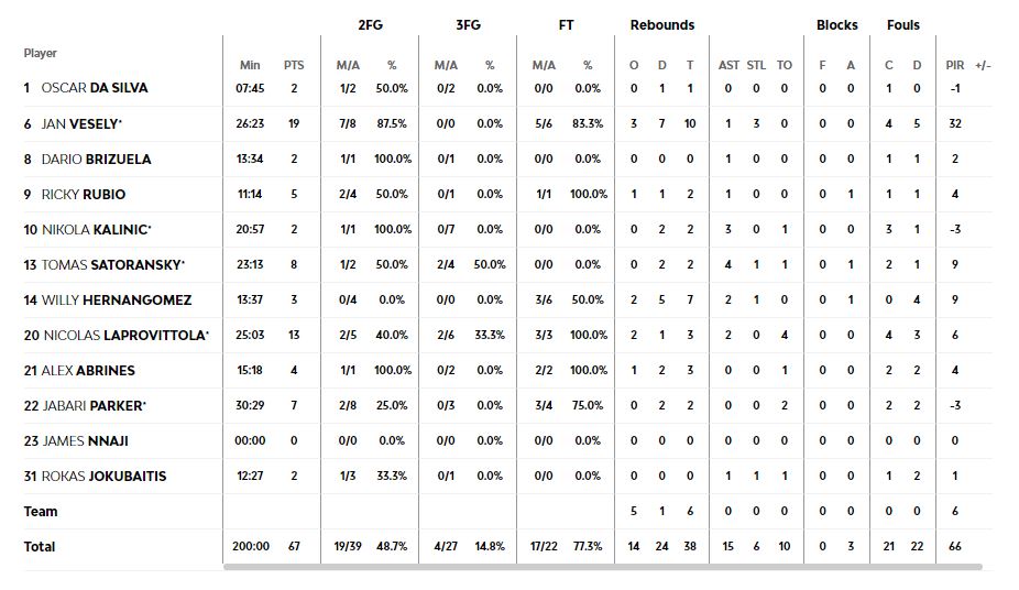 ΠΗΓΕ ΣΤΡΑΦΙ Η ΑΠΟΔΟΣΗ ΤΟΥΣ: Ο Γιαν Βέσελι ήταν αποτελεσματικός με 19 πόντους (7/8 δίποντα, 5/6 βολές), 10 ριμπάουντ και 3 κλεψίματα.