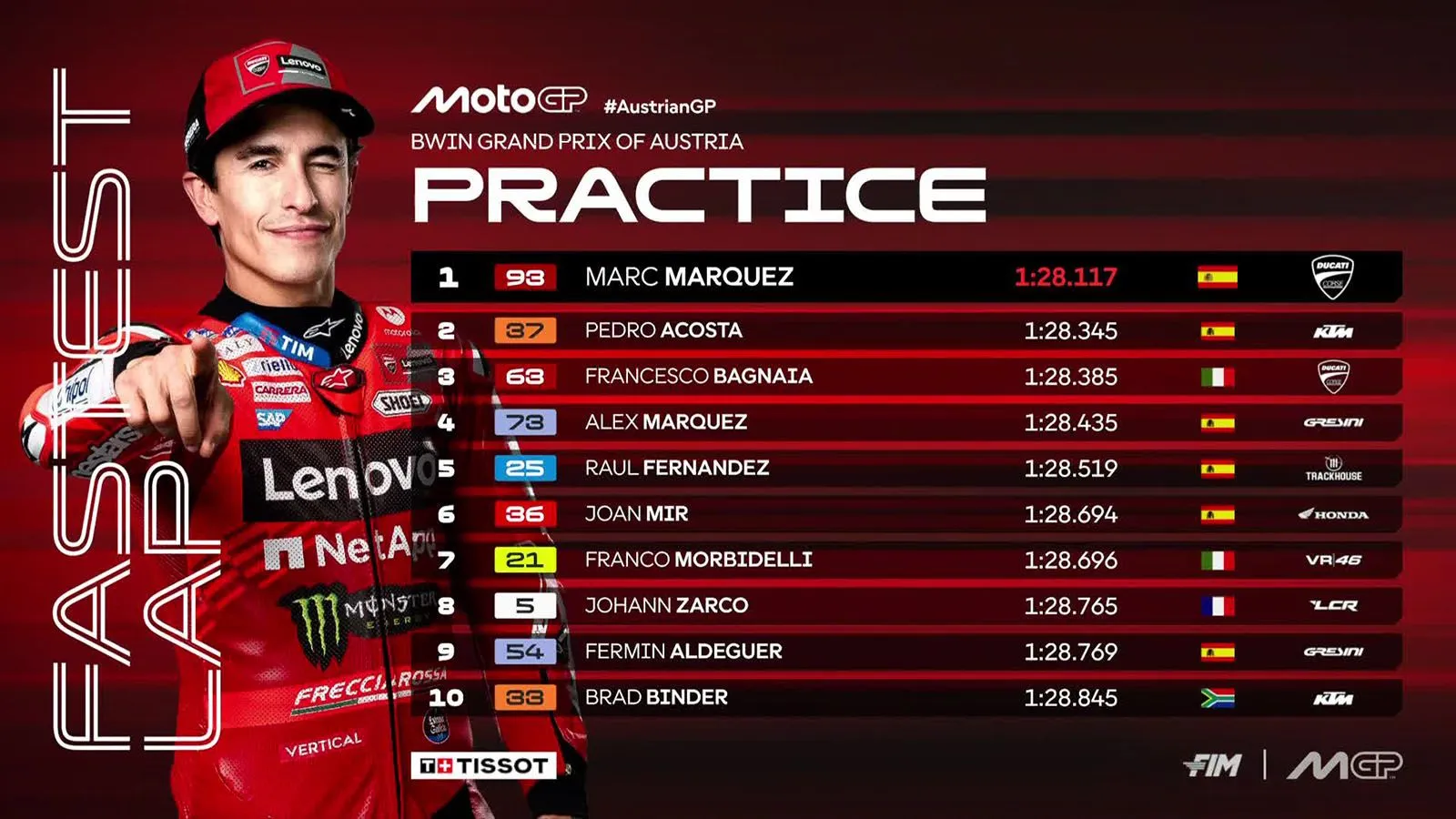 Ducati’s Marc Marquez continued his dominant performance in the timed tests of the MotoGP Austria, once again climbing to the top of the times with a difference of more than two tenths from Pedro Acosta who impresses at the home of KTM.