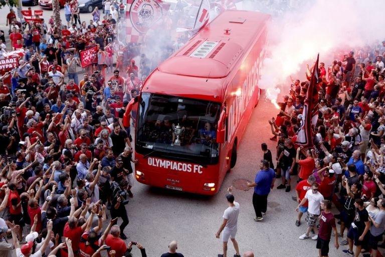 Μερικοί οπαδοί του Ολυμπιακού περίμεναν την άφιξη του πούλμαν, για να υποδεχτούν τους πρωταθλητές Ελλάδας και να τους εμψυχώσουν.