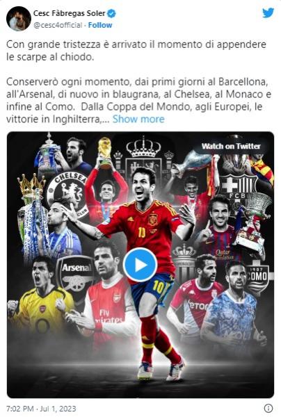"Unfortunately, the time has come for me to hang up my football boots. I will keep all the moments, from my first days at Barca, Arsenal, Barca again, Chelsea, Monaco and Como.